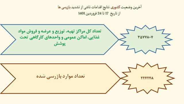 در عین حال طبق اعلام معاونت بهداشت وزارت بهداشت، بر اساس اقدامات ناشی از تشدید بازرسیها از تاریخ 17 تا 24 فروردین ماه 1401، از تعداد 3577807 مرکز تهیه، توزیع و عرضه و فروش مواد غذایی، اماکن عمومی و واحدهای کارگاهی تحت پوشش، بالغ بر 224248 مورد بازرسی انجام شده است.