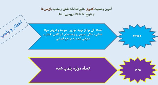 همچنین طی این مدت تعداد 37162 مرکز از مراکز تهیه، توزیع، عرضه و فروش مواد غذایی، اماکن عمومی و واحدهای کارگاهی اخطار گرفته و به مراجع قضایی معرفی شدهاند و 1265 مورد از این مراکز نیز پلمب شدهاند.