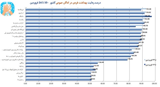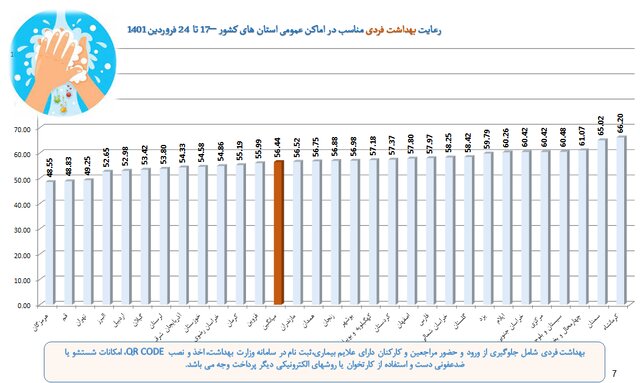 در عین حال میانگین میزان رعایت بهداشت فردی در اماکن عمومی استانهای کشور در بازه زمانی 17 تا 24 فروردین ماه 1401، بالغ بر 56.44 درصد بوده است. در این شاخص بیشترین میزان رعایت در استان کرمانشاه با 66.20 درصد و کمترین میزان رعایت هم در استان هرمزگان با 43.55 درصد بوده است.