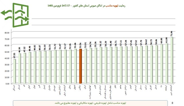 میانگین رعایت تهویه مناسب در اماکن عمومی استانهای کشور از 17 تا 24 فروردین ماه 1401، 53.56 درصد بوده است. در عین حال بیشترین میزان رعایت مربوط به استان آذربایجان غربی با 71.96 درصد و کمترین میزان رعایت مربوط به هرمزگان با 37.55 درصد بوده است.
