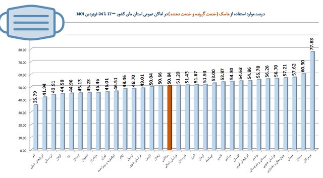 میانگین استفاده از ماسک در شاغلین و خدمت گیرندگان به تفکیک اماکن عمومی استانهای کشور از 17 تا 24 فروردین ماه 1401 بالغ بر 50.84 درصد بوده است که بیشترین میزان رعایت در استان هرمزگان با 77.83 درصد و کمترین میزان رعایت مربوط به قم با 35.79 درصد بوده است.