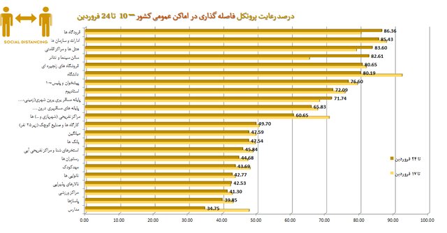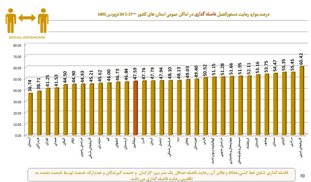 میانگین درصد رعایت پروتکل فاصلهگذاری در اماکن عمومی استانهای کشور از 17 تا 24 فروردین ماه 1401، 47.59 درصد بوده است که بیشترین میزان رعایت مربوط به استان آذربایجان غربی با 60.42 درصد و کمترین میزان رعایت مربوط به لرستان با 36.74 درصد بوده است.