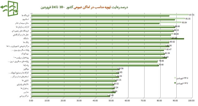 همچنین میانگین رعایت تهویه مناسب در اماکن عمومی کشور از 10 تا 24 فروردین ماه 1401، 53.56 درصد بوده است. فرودگاهها با 97.73 درصد رعایت تهویه مناسب در بالاترین سطح رعایت و مراکز ورزشی با 47.40 درصد در قعر رعایت این پروتکل قرار دارند.