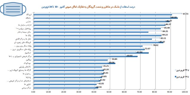 همچنین میانگین استفاده از ماسک در شاغلین و خدمت گیرندگان به تفکیک اماکن عمومی کشور نیز از 10 تا 24 فروردین ماه 1401 بالغ بر 50.84 درصد بوده است که بیشترین میزان استفاده از ماسک در اماکن عمومی مربوط به فرودگاهها با 97.73 درصد و کمترین میزان استفاده از ماسک مربوط به مراکز ورزشی با 40.56 درصد است.