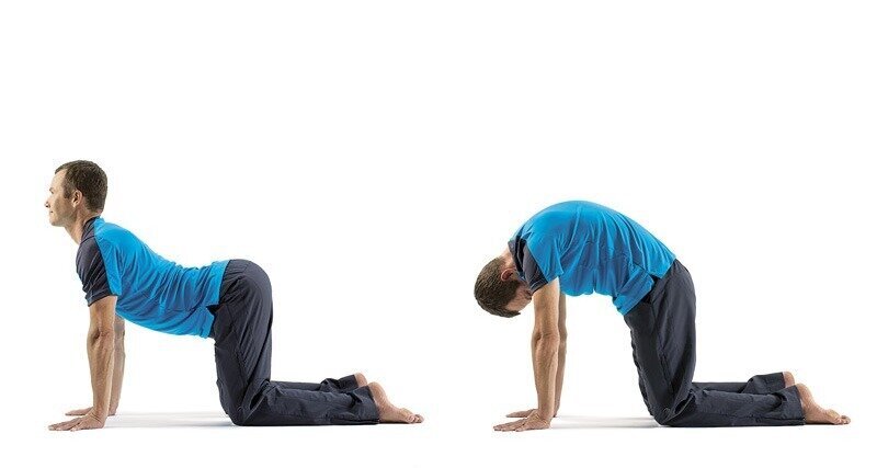 بسیاری از حرکات یوگا جریان خون را در دستگاه گوارش افزایش میدهد و میتواند به تحریک انقباضات روده کمک کند. با قرار دادن دست و زانو روی زمین شروع کنید. مطمئن شوید که زانوهایتان زیر باسن، و مچ دستتان زیر شانههایتان باشد. در حالت خنثی ستون فقرات، با پشت صاف و شکم درگیر شروع کنید. یک دم عمیق بکشید. هنگام دم، کمر خود را قوس دهید، اجازه دهید شکمتان شل شود. سپس سر خود را بالا بگیرید، بدون اینکه فشاری به گردن خود وارد کنید. هنگام بازدم، ستون فقرات خود را به سمت سقف گرد کنید. ناف خود را به سمت ستون فقرات خود بکشید و شکم خود را درگیر کنید. چانه خود را به سمت قفسه سینه جمع کنید و اجازه دهید گردنتان آزاد شود. حداقل 10 مرتبه این حرکت را تکرار کنید.