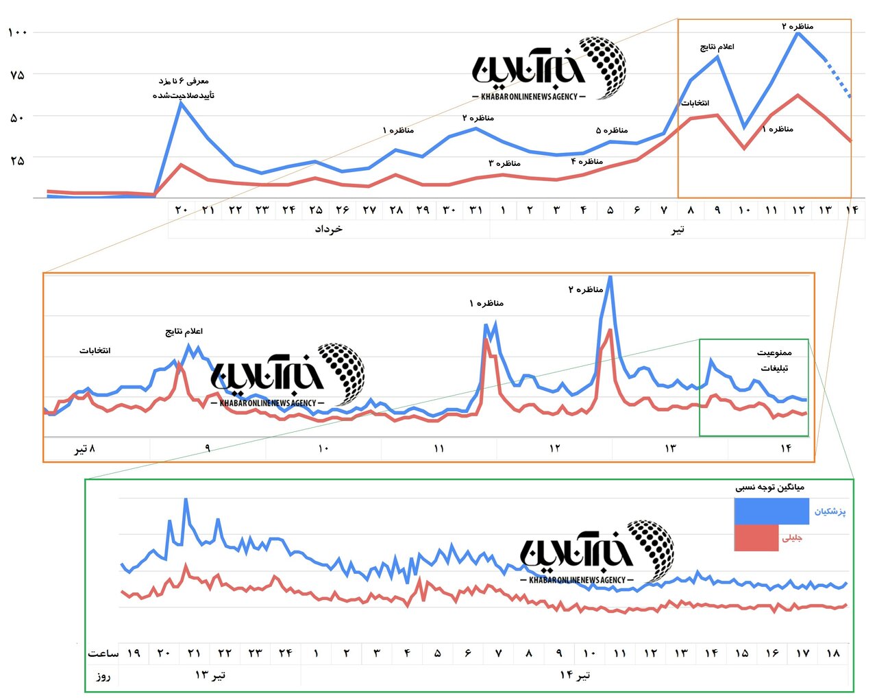 ذوالفقار دانشی - به دلیل منع قانونی تبلیغات انتخابات در روز پنجشنبه 14 تیر (یک روز قبل از برگزاری انتخابات)، حجم خبرهای مرتبط با دو نامزد حاضر در مرحله دوم انتخابات طی روز چهارشنبه 13 تیر بسیار زیاد بود و با فرا رسیدن پنجشنبه، موج تبلیغات فرو نشست، با این حال تغییر خاصی در سهم توجه عمومی به مسعود پزشکیان و سعید جلیلی ایجاد نشد.
