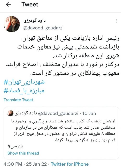 به گزارش شامگاه سه شنبه ایرنا داوود گودرزی در حساب شخصی خود در توییتر نوشت: رییس اداره بازیافت یکی از مناطق تهران در حالی بازداشت شد که مدتی پیش نیز معاون خدمات شهری این منطقه برکنار شد.