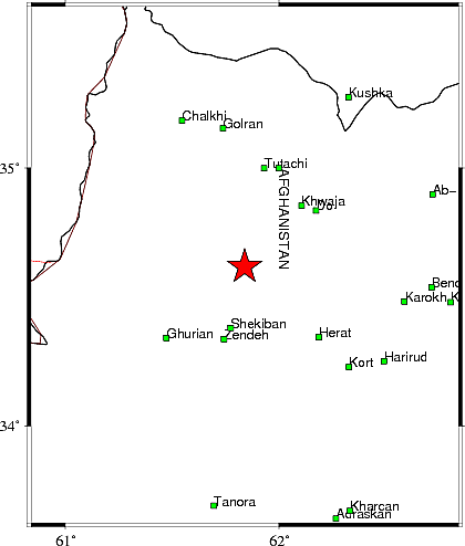 موقعیت رومرکز زلزله: 34.62 شمالی و 61.84 شرقی عمق: 12 کیلومتر عدم قطعیت مکانی: 0.87+/- کیلومتر در جهت شمالی - جنوبی 4.44+/- کیلومتر در جهت شرقی - غربی منطقه:افغانستان