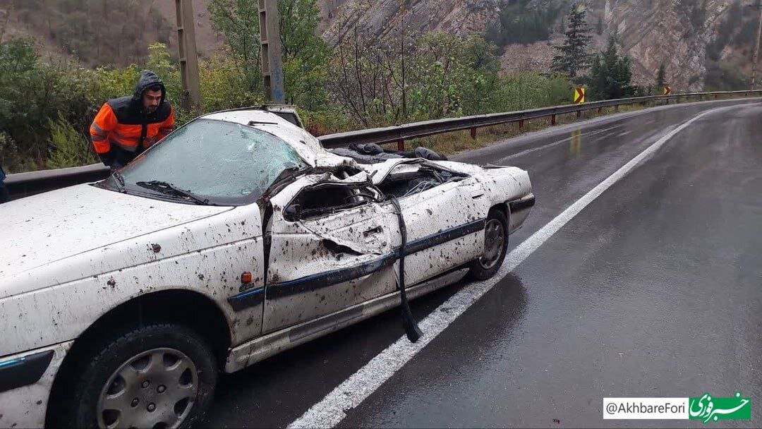 سقوط سنگ روی خودرو در چالوس؛ پژو مچاله شد / عکس