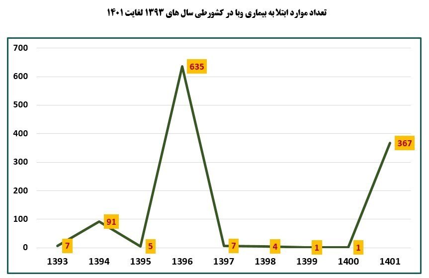 در سال 1401 به دنبال وقوع طغیان وبا در برخی از کشورهای همجوار از جمله عراق، افغانستان و پاکستان از تاریخ 27 خردادماه سال 1401 مواردی از ابتلا به این بیماری در استانهای واقع در مرزهای غربی کشور ما نیز شناسایی و پس از آن موارد وبا در برخی از سایر مناطق کشور نیز گزارش شد. به دنبال وقوع طغیان این بیماری در کشور در مجموع 367 مورد ابتلا به وبا گزارش شد. موارد ابتلا که از اواخر خردادماه آغاز شده بود تا پایان آبان ادامه داشت و از هفته پایانی آبان ماه تا پایان سال گذشته، مورد جدیدی از ابتلا به وبا در کشور گزارش نشد.