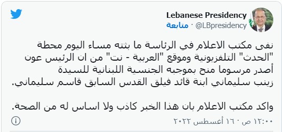 ریاست جمهوری لبنان اعطای شهروندی این کشور به «زینب سلیمانی»، دختر سردار شهید حاج قاسم سلیمانی را تکذیب کرد. در بیانیه رسمی دفتر ریاست جمهوری لبنان آمده: «گزارش منتشرشده در شبکه «الحدث» و پایگاه «العربیه. نت» درباره اینکه «میشل عون» حکم اعطای شهروندی لبنان به «زینب سلیمانی»، دختر قاسم سلیمانی، فرمانده سابق نیروی قدس را امضا کرده بی اساس است».