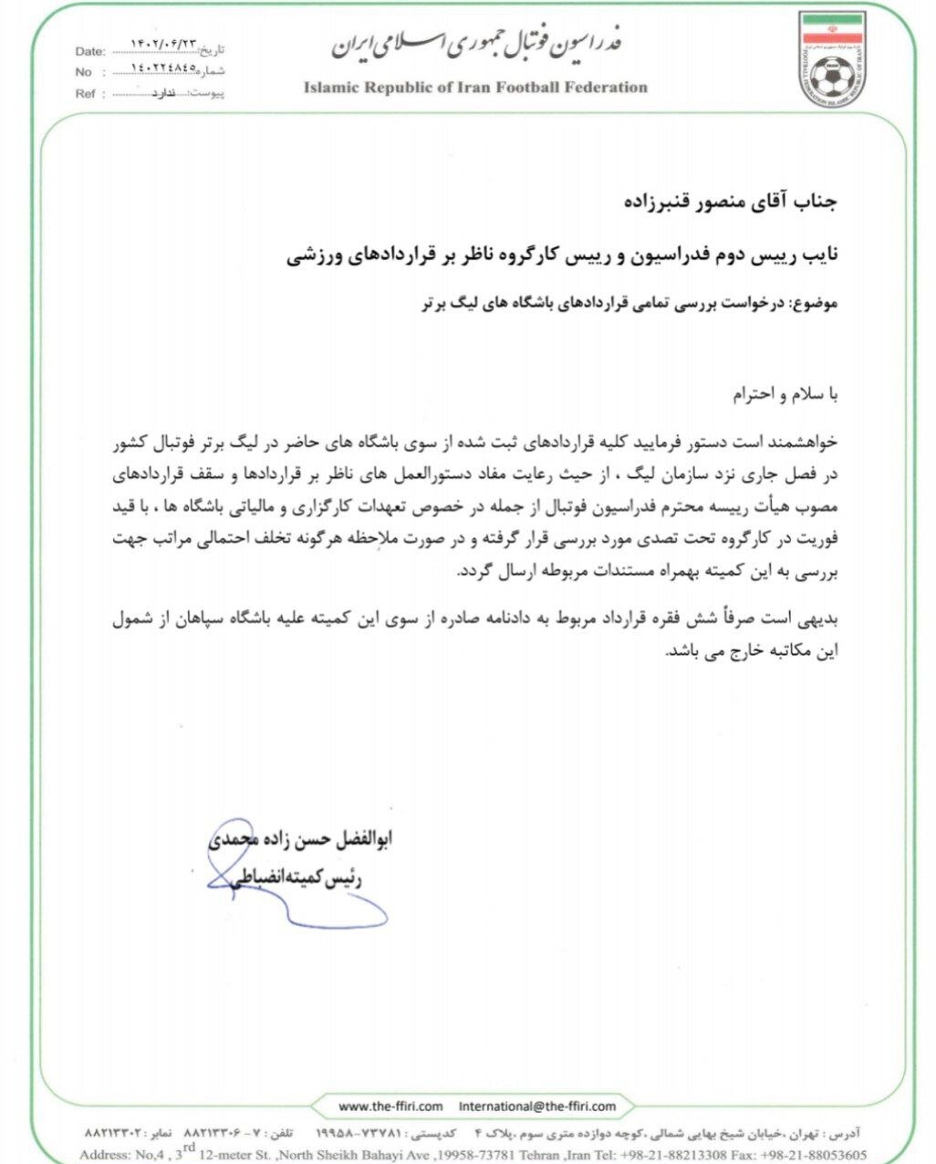 به گزارش خبرگزاری خبرآنلاین، ابوالفضل حسنزاده، رئیس کمیته انضباطی فدراسیون فوتبال با ارسال نامهای به منصور قنبرزاده، نایب رئیس دوم و رئیس کارگروه ناظر بر قراردادهای این فدراسیون درخواست کرد کلیه قراردادهای ثبت شده از سوی باشگاههای حاضر در لیگ برتر به قید فوریت در این کارگروه تحت بررسی قرار گرفته است.