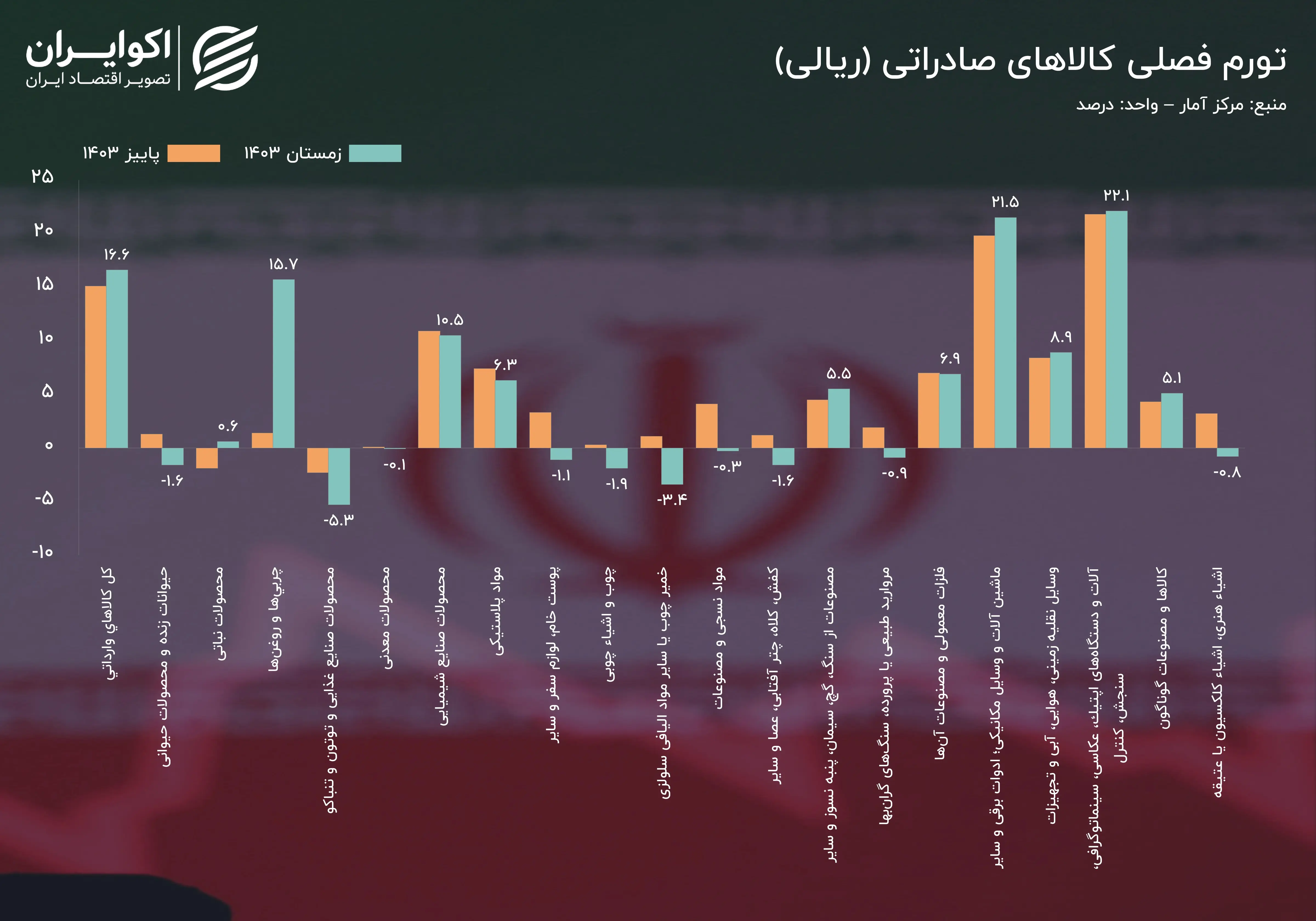 در مقابل، برخی گروههای وارداتی در زمستان با کاهش تورم مواجه بودهاند. برای مثال، گروه حیوانات زنده و محصولات حیوانی که در پاییز تورم 1.3 درصدی داشت، در زمستان به تورم منفی 1.6 درصد رسید. همچنین گروه محصولات صنایع غذایی، توتون و تنباکو نیز از تورم منفی 2.3 درصدی در پاییز به منفی 5.3 درصد در زمستان رسید که نشانگر تداوم کاهش هزینه واردات در این بخش است. این تحولات میتواند ناشی از ثبات یا افت قیمت جهانی این محصولات یا کاهش سطح واردات به دلیل تغییرات در سیاست ارزی و تجاری کشور باشد.
