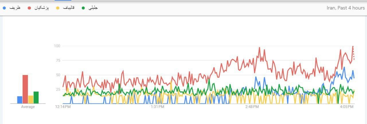 به گزارش خبرگزاری خبرآنلاین، بنابر گزارش هم میهن، همان طور که جستجوهای گوگل نشان میدهد، در شرایطی که قالیباف (رنگ زد) و جلیلی (رنگ سبز) در انتخابات حضور دارند، این ظریف (رنگ آبی) است که بیشتر مورد توجه مردم قرار دارد. به نظر میرسد با میزگرد امروز، انتخابات وارد سطح دیگری شود و سرعت رشد پزشکیان در نظرسنجیها افزایش یابد.