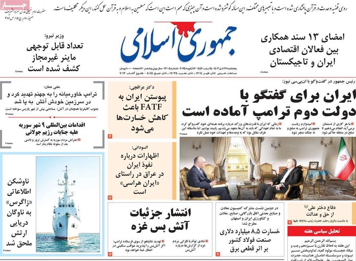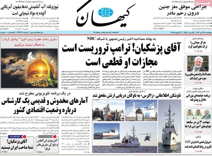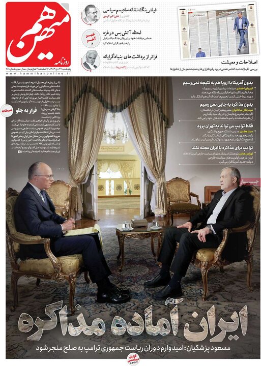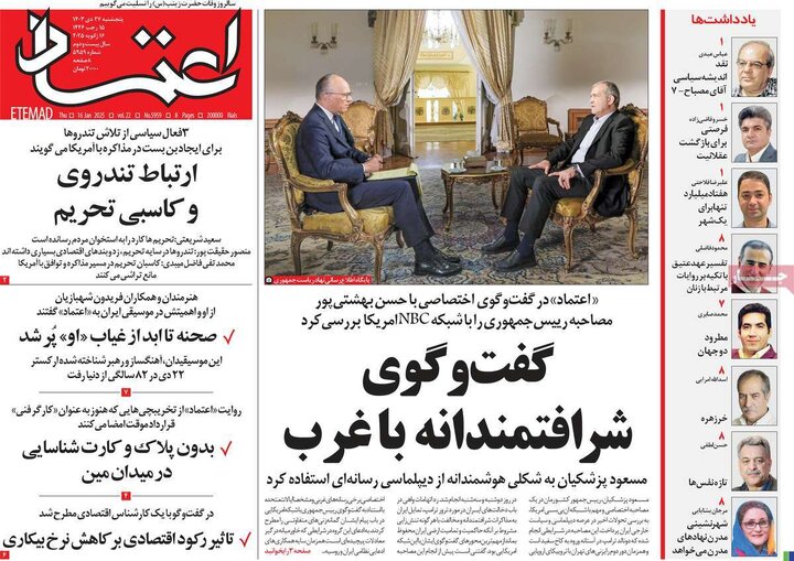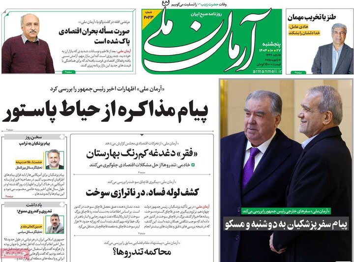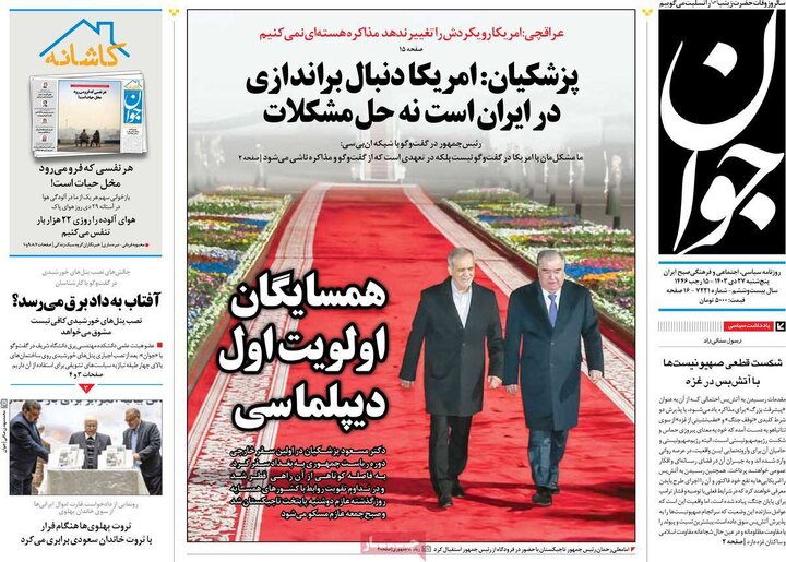 آغاز سفر پزشکیان به تاجیکستان و روسیه، بازتاب مصاحبه رئیس جمهور با رسانه امریکایی، آتش بس در غزه، واکنشها به استیضاح وزیر اقتصاد و... از تیترهای مطبوعات امروز است.