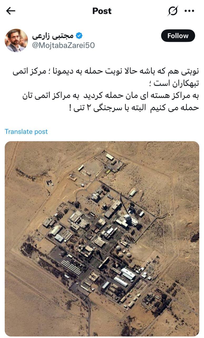 نوبتی هم که باشه حالا نوبت حمله به دیمونا؛ مرکز اتمی تبهکاران است؛ به مراکز هستهای مان حمله کردید به مراکز اتمیتان حمله میکنیم البته با سرجنگی 2 تنی!