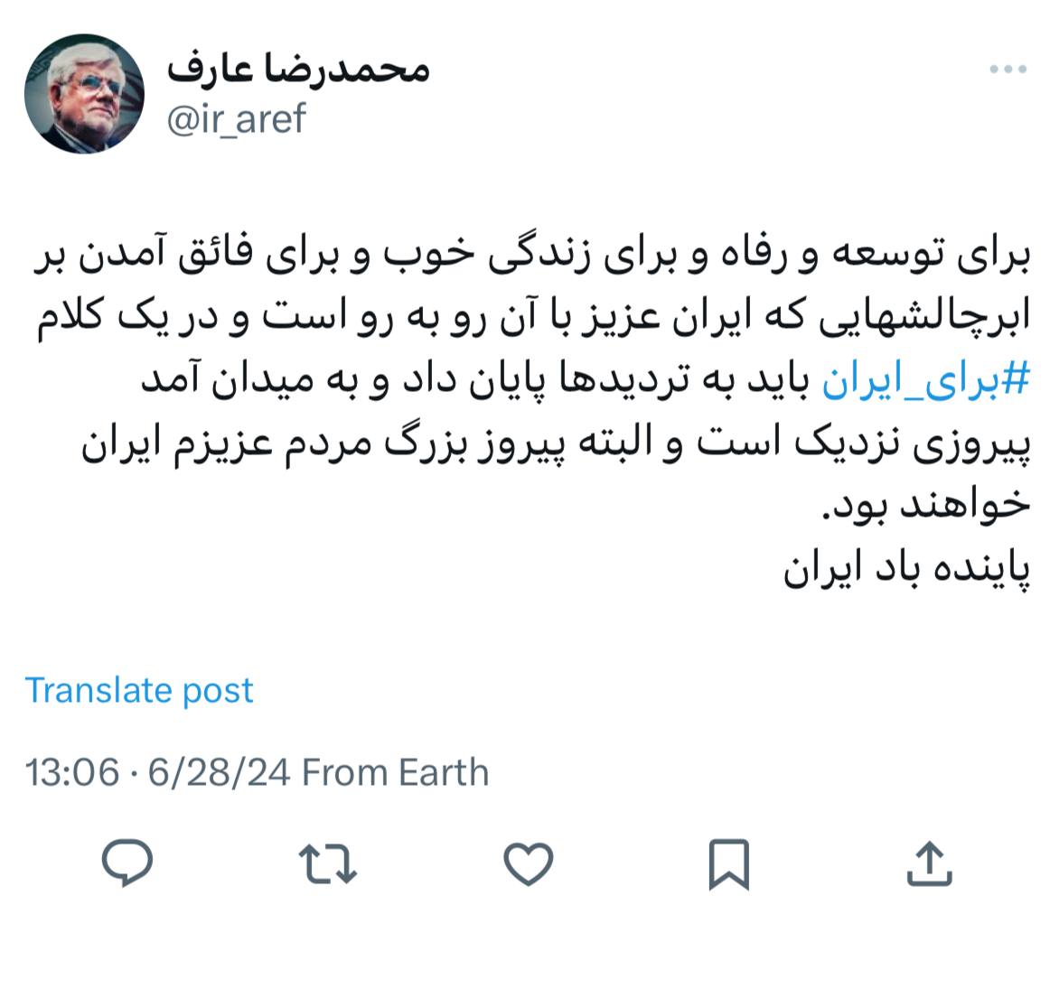 برای توسعه و رفاه و برای زندگی خوب و برای فائق آمدن بر ابرچالش هایی که ایران عزیز با آن رو به رو است و در یک کلام #برای_ایران باید به تردیدها پایان داد و به میدان آمد پیروزی نزدیک است و البته پیروز بزرگ مردم عزیزم ایران خواهند بود.