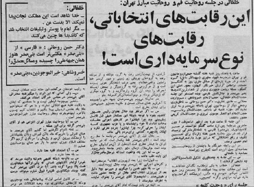 اکنون دارد یک مرحلهی خطرناکی پیش میآید بین طرفداران بنیصدر و جلالالدین فارسی. بین روحانیت مبارز تهران و حوزهی علمیهی قم چه اختلافی است در تایید این دو نفر کاندیدا که امروز این سر و صدا را بپا کرند.