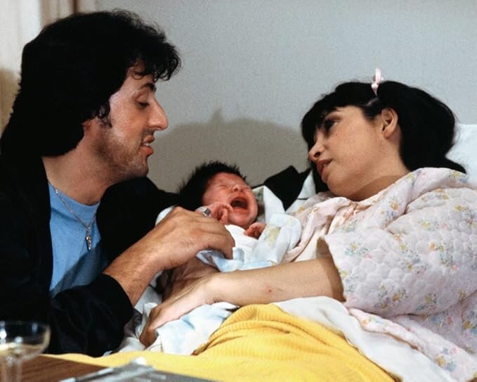 تصویری که میبینید لحظهای از فیلم راکی دو است که استالونه صاحب فرزندی شده و دچار تردید برای مبارزه با «آپولو کرید» مشتزن حرفهای شده است.