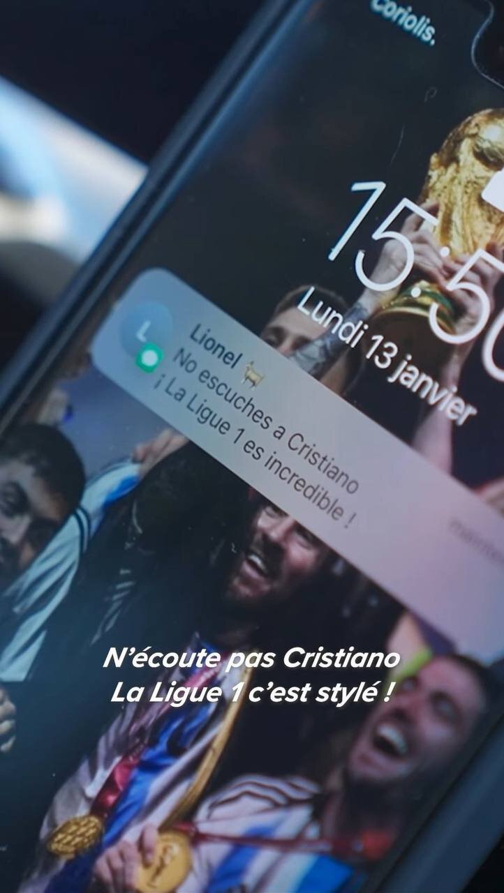 در این ویدیو پیامی از مسی لیونل مسی روی صفحه موبایل آلمادا نشان داده می شود که نوشته: «به حرف کریستیانو گوش نده. لیگ 1 بینظیره!»