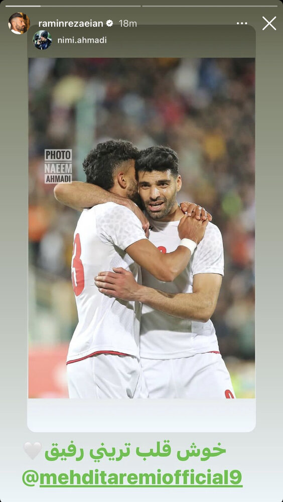 پس از به ثمر رسیدن گل دوم ایران مهدی طارمی و رامین رضاییان شادی دونفرهای داشتند که مدافع راست تیم ملی تصویر مربوط به آن را استوری کرد و خطاب به مهدی طارمی نوشت:«خوشقلبترینی رفیق.»