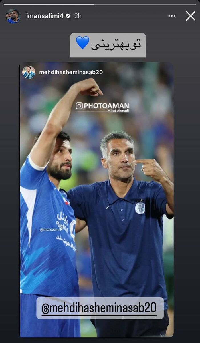 به گزارش خبرگزاری خبرآنلاین؛ ایمان سلیمی مدافع تیم استقلال که گل برتری آبیها در بازی با فولاد را به ثمر رساند در صفحه اجتماعی خودش تصویری با مهدی هاشمی نسب را منتشر کرد و از مربی خود تشکر کرد. ایمان سلیمی با انتشار استوری در صفحه شخصی خودش و نوشتن جمله " تو بهترین هستی" از مهدی هاشمی نسب تقدیر کرد.
