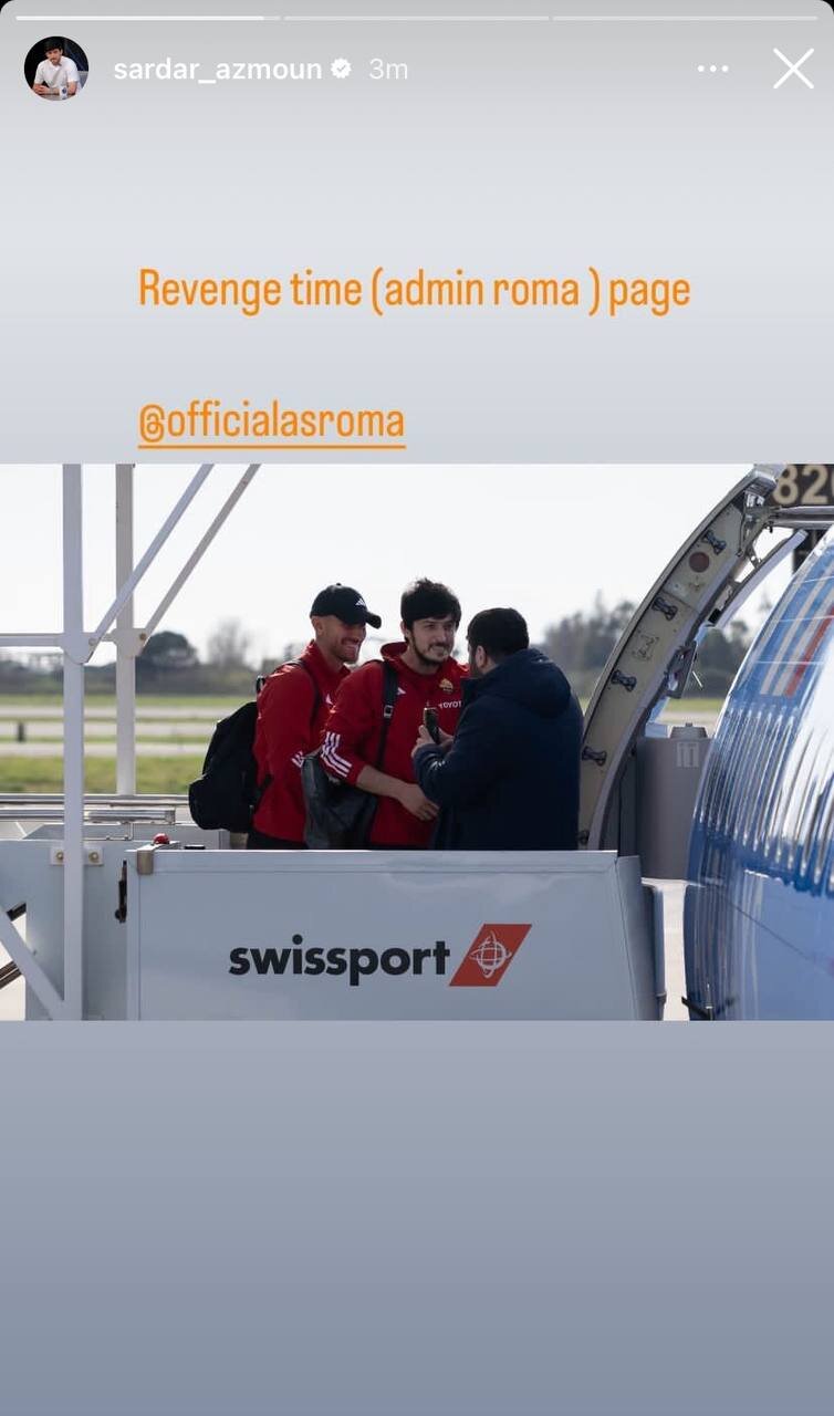 به گزارش خبرگزاری خبرآنلاین؛ تیم رم پنجشنبه شب با حضور سردار آزمون به مصاف برایتون رفت و با وجود شکست یک بر صفر در انگلیس، به مرحله یکچهارم نهایی لیگ اروپا راه یافت. سردار آزمون که در بازی با برایتون یکی از نفرات ثابت رم بود، در بازگشت به ایتالیا تصاویری همراه با ادمین صفحه اینستاگرام این تیم منتشر و از عبارت انتقام استفاده کرد.