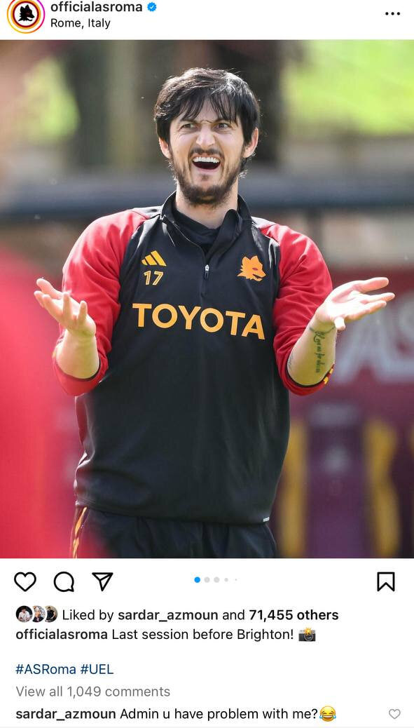 چند روز قبل بود که صفحه اینستاگرام باشگاه رم عکسی جالب را از آزمون به اشتراک گذاشت که او را با ژست خاصی نشان میداد. این موضوع هم باعث شد که خودش به این پست واکنش نشان دهد و او به شوخی کامنت گذاشت: «ادمین تو با من مشکل داری؟»