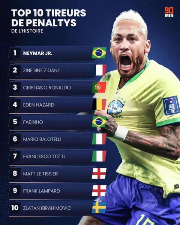 به گزارش خبرگزاری خبرآنلاین؛ نیمار جونیور، کاپیتان تیم ملی برزیل به عنوان «بهترین پنالتی زن تاریخ فوتبال» از سوی سایت 90 مین انتخاب شد. بر اساس گزارش 90 مین، نیمار از 91 ضربه پنالتی که در دوران فوتبالی اش زده 74 بار را به گل تبدیل کرده و 17 بار را خراب کرده تا از این حیث بهترین فوتبالیست تاریخ شود.10 پنالتی زن برتر تاریخ فوتبال از دید این رسانه انگلیسی به ترتیب زیر است:
