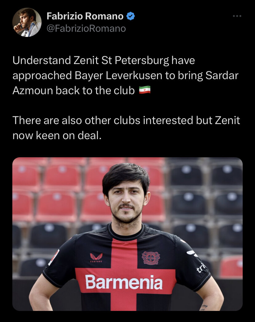 به گزارش خبرگزاری خبرآنلاین؛ با اعلام فابریتزیو رومانو، تیم زنیت سنت پترزبورگ روسیه به دنبال بازگرداندن سردار آزمون است و مذاکرات این باشگاه با بایر لورکوزن آغاز شده است.