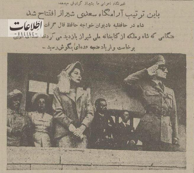 محمدرضا پهلوی و همسرش ثریا در اردیبهشت 72 سال پیش راهی شیراز شدند تا مقبره جدید سعدی را در شیراز افتتاح کنند. در همان روز شاه در حافظیه تفالی به دیوان حافظ زد که غزلی با این مطلع نتیجه فال بود: دلا رفیق سفر بخت نیکخواهت بس / نسیم روضه شیراز پیک راهت بس./ اطلاعات آنلاین