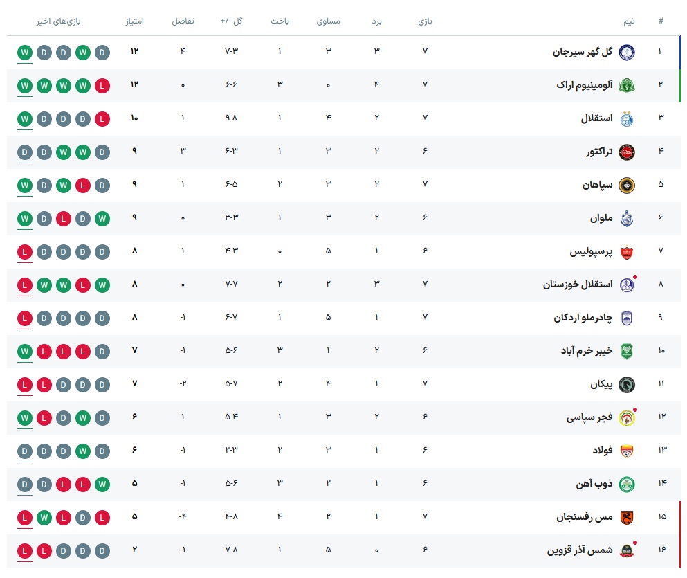 به گزارش خبرگزاری خبرآنلاین؛ هفته هفتم لیگ برتر با باخت پرسپولیس مقابل خیبر در یک بازی دراماتیک به پایان رسید تا جدول لیگ به شکل زیر در بیاید؛