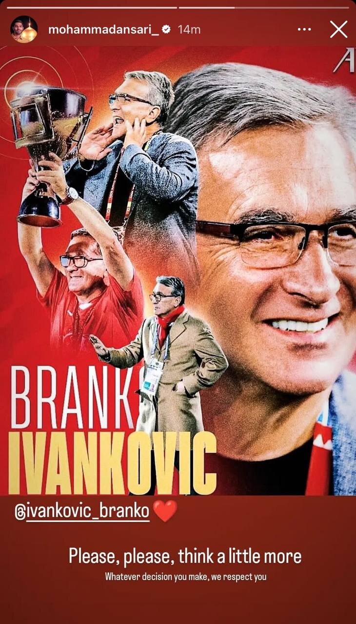 پس از اعلام منتفی شدن حضور برانکو در ایران، محمد انصاری، مدافع اسبق پرسپولیس که در مقطعی شاگرد مرد کروات هم بود با انتشار یک استوری از او خواست بیشتر فکر کند و به پیشنهاد سرخها پاسخ مثبت دهد.