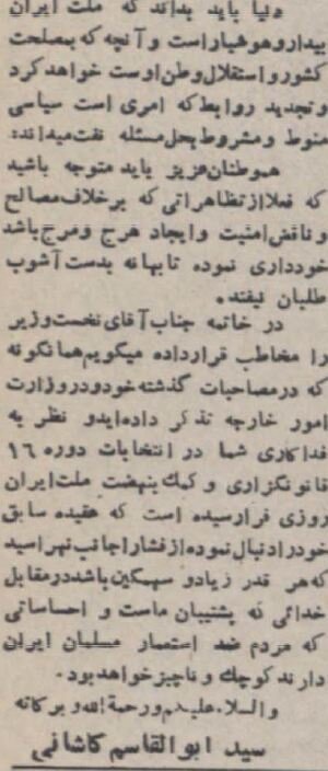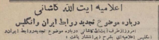 آیتالله ابوالقاسم کاشانی با صدور اطلاعیهای درباره تجدید روابط ایران و انگلستان و دکتر محمد مصدق اظهار نظر کرد. این بیانیه در 12 آذر 1332 در روزنامه اطلاعات منتشر شد. بخشهایی از بیانیه آیتالله کاشانی را بخوانید و عکسهایی از این مرجع عالم تشیع در همان دوران تماشا کنید.