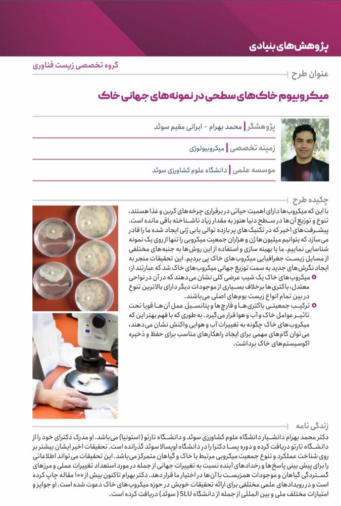 محمد بهرام ایرانی مقیم سوئد برگزیده بخش پژوهش های بنیادی در گروه تخصصی زیست فناوری با ارائه طرح «میکروبیوم خاک های سطحی در نمونه های جهانی خاک» در سایت جشنواره البته چکیده مقاله و رزومه این برگزیده به چشم می خورد. یک میکروبیولوژیست با مدرک پست دکتراست که در دانشکده کشاورزی دانشگاه تاتارو در سوئد مشغول تدریس است.