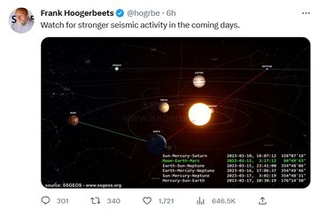 هوگربیتز کمتر از یک روز پیش، درباره موقعیت سیاره زهره و نقش آن در زلزله ترکیه توئیت زد:«سیاره زهره نقش مهمی را در زلزله روز ششم فوریه ایفا کرد. اینجا ما آماری ارائه می دهیم که بتوانید همبستگی قوی و غیرقابل انکار بین سیاره زهره و زلزله های بزرگ را مشاهده کنید.»