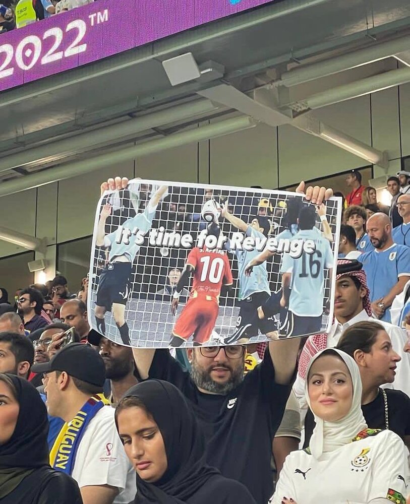 عکسی از یکی از طرفدارن غنا در ورزشگاه ثبت شده است که با گرفتن یک عکس در دستش به ماجرای هند کردن توپ توسط سوارز و حذف غنا در سال 2010 اشاره می کند. روی عکس نوشته شده است: «این زمان انتقام است.»