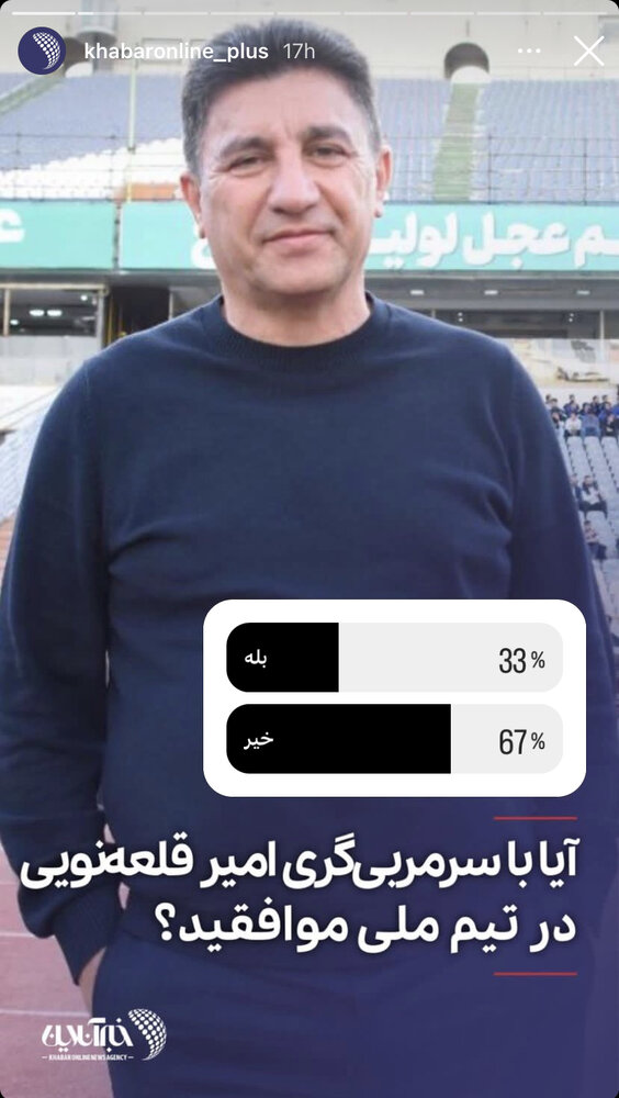 سپردن تیم ملی کشورمان به امیر قلعهنویی در حالی است که انتخاب مربی داخلی موافقان و مخالفان زیادی داشته و دارد. در نظرسنجی صفحه اینستاگرام خبرآنلاین پرسیده بودیم که آیا با سرمربیگری امیر قلعهنویی در تیم ملی موافق هستید که 67 درصد رایدهندگان مخالف و 33 درصد موافق حضور او بودند.