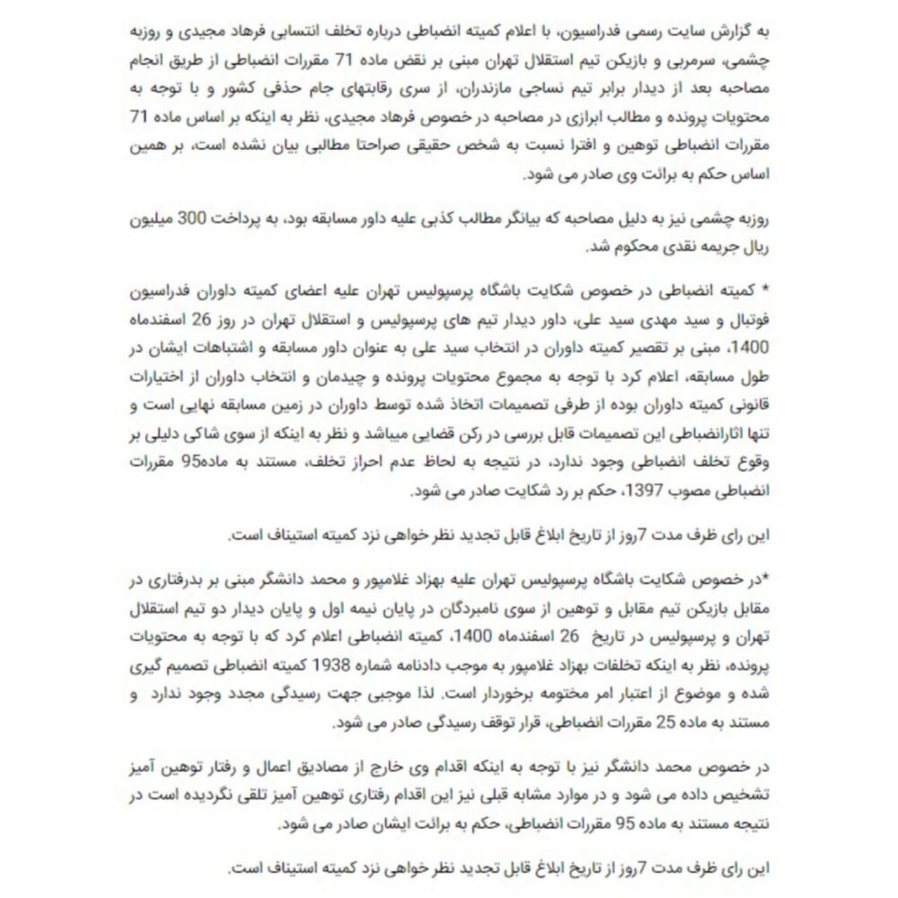 سایت فدراسیون فوتبال نوشت: آرای کمیته انضباطی اعلام شد.