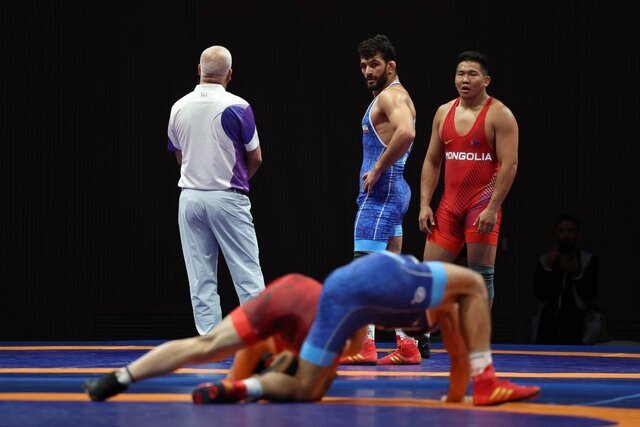ایسنا نوشت: کاپیتان تیم ملی کشتی آزاد در حالی که مشغول مبارزه با کشتیگیر مغول بود، نگاهی هم به نتیجه مبارزه یونس امامی مقابل حریف تاجیکستانی داشت.