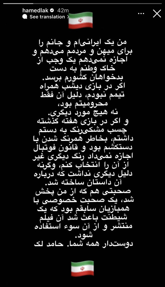 به گزارش خبرگزاری خبرآنلاین؛ غیبت حامد لک در بازی روز گذشته مس رفسنجان باعث سوالات زیادی شد و او با انتشار یک استوری به آن واکنش نشان داد.