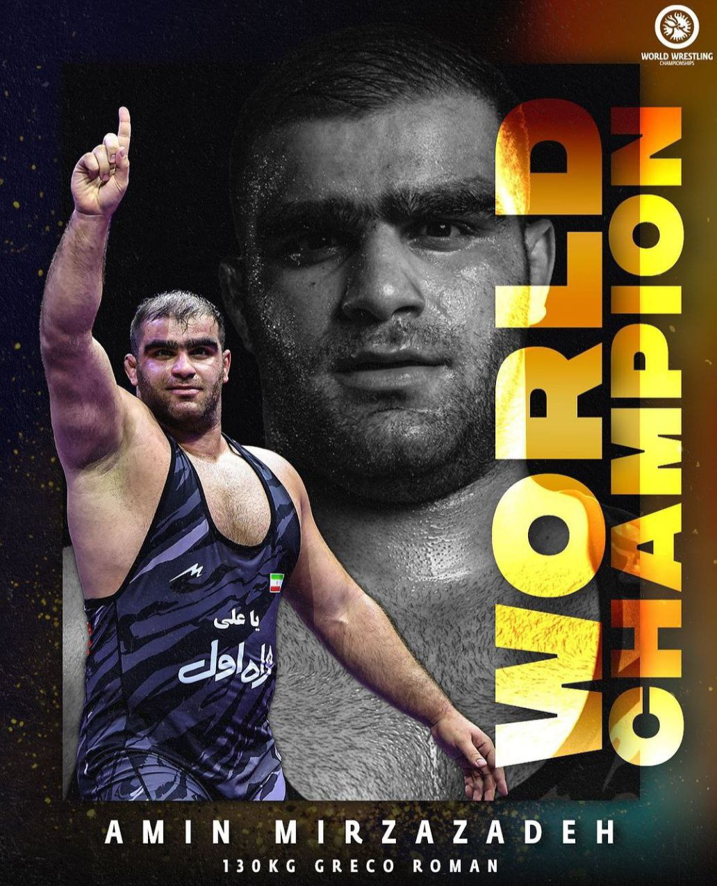 اتحادیه جهانی کشتی با انتشار عکسی از میرزازاده نوشت: پادشاه جدید اینجاست. امین میرزازاده مانع ششمین طلای جهانی کایالپ شد.