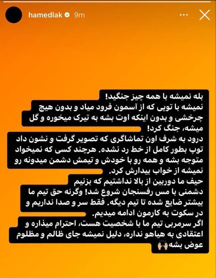 حال دقایقی پیش حامد لک با انتشار استوری زیر جواب استوری شب گذشته نکونام را داد؛