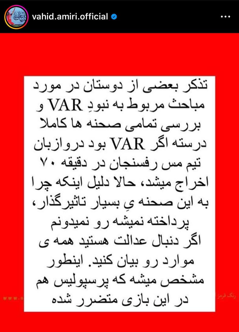 وحید امیری پستی را در اینستاگرام خود در مورد داوری بازی پایانی منتشر کرد.