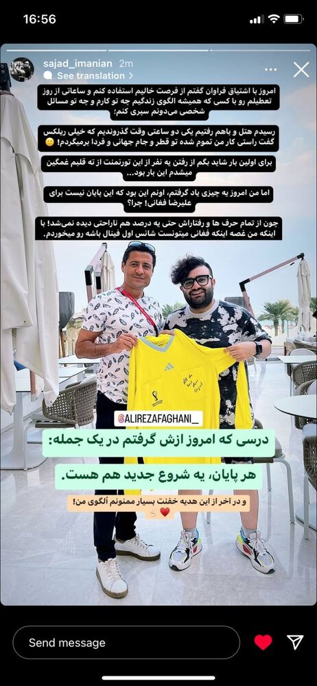 نام فغانی در لیست داوران مرحله یک هشتم نهایی نبود و حالا سجاد ایمانیان عکاس و مسئول سوشال مدیا فیفا با انتشار استوری در صفحه اینستاگرامش خبر از پایان کار فغانی در جام جهانی داده است. او با انتشار تصویری کنار علیرضا فغانی نوشته است که کار جام جهانی به پایان رسیده است و دیدار فینال را سوت نخواهد زد.