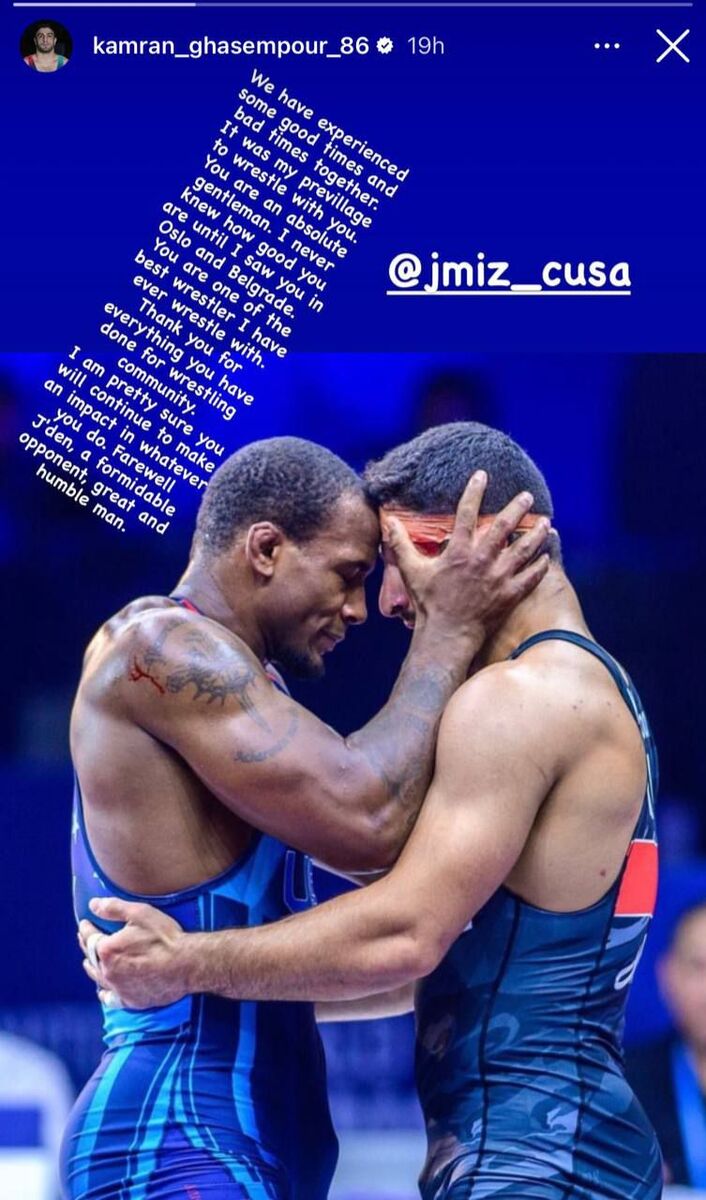 او با انتشار استوری در صفحه اینستاگرامش نوشت: ما لحظات خوب و بدی را با هم تجربه کردیم. برای من کشتی گرفتن با تو باعث افتخار بود. تو یک مرد واقعی هستی. نمیدانستم اینقدر خوبی تا اینکه در اسلو و بلگراد با تو دیدار کردم. تو یکی از بهترین کشتیگیرانی هستی که من با او رقابت کردم. بهخاطر هر کاری که برای کشتی کردی از تو ممنونم. اطمینان دارم هر جایی باشی تاثیرگذار خواهی بود. خداحافظ جیدن رقیب سخت و قدرتمند و انسان بزرگ و فروتن.