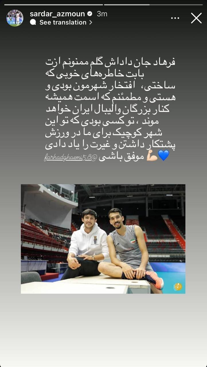 جدایی فرهاد قائمی از شهداب یزد باعث شد تا این بازیکن از دنیای والیبال خداحافظی کند و دیگر این ملی پوش سابق دوست داشتنی والیبال ایران را به عنوان بازیکن در زمین نبینیم. به همین مناسبت سردار آزمون با انتشار استوری در صفحه اینستاگرامش از فرهاد قائمی تشکر کرد. 257 251 برای دسترسی سریع به تازهترین اخبار و تحلیل رویدادهای ایران و جهان اپلیکیشن خبرآنلاین را نصب کنید. کد خبر 1931509