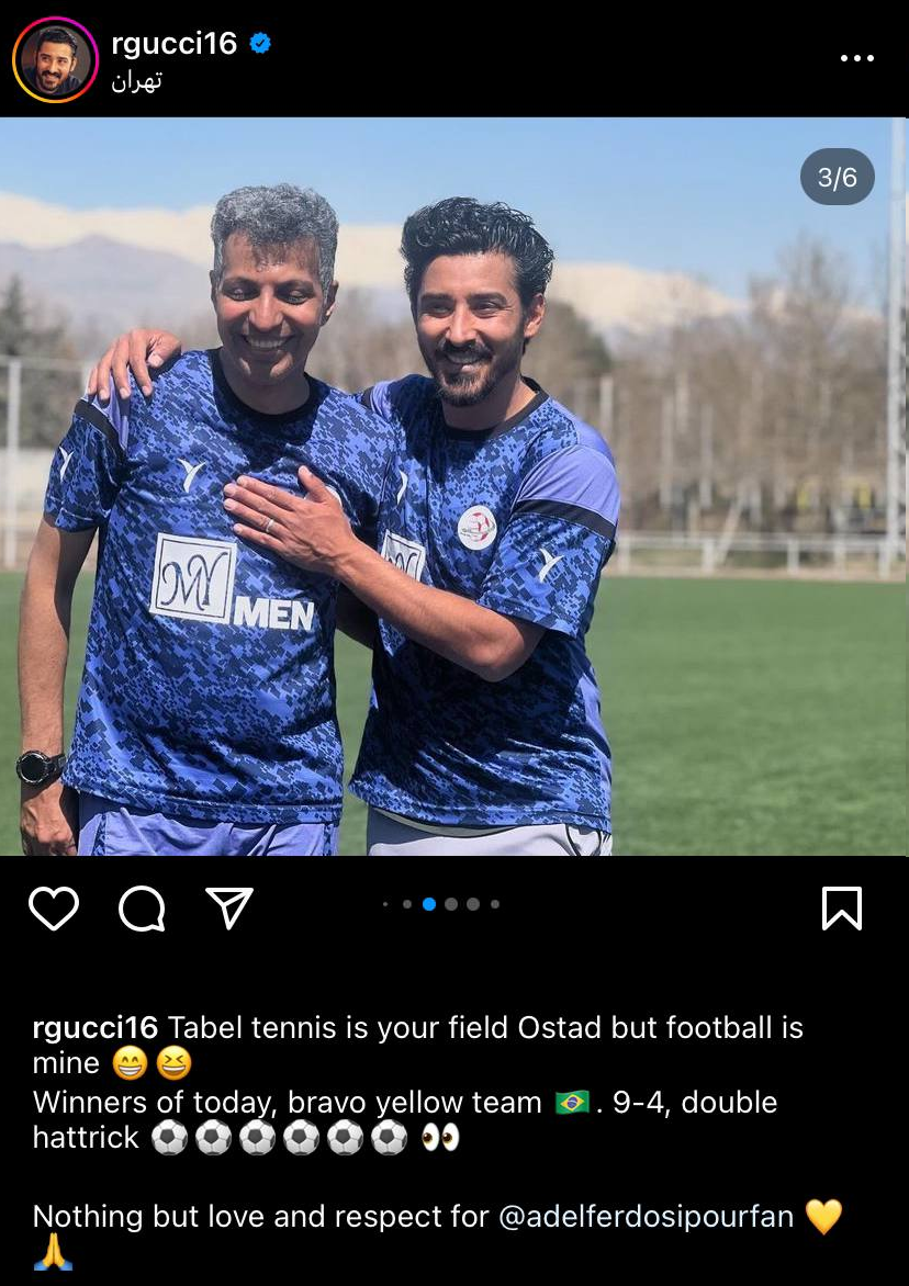 او دیروز در دیداری دوستانه به مصاف تیم عادل فردوسی پور رقت و پس از بازی پست زیر را در اینستاگرام منتشر کرد و نوشت: «تنیس روی میز تخصص شماست اما فوتبال برای من است، برنده بازی امروز، آفرین تیم زرد با نتیجه 9-4 و دبل هتریک، چیزی نیست، عشق و احترام زیادی برات قائلم عادل فردوسی پور.»