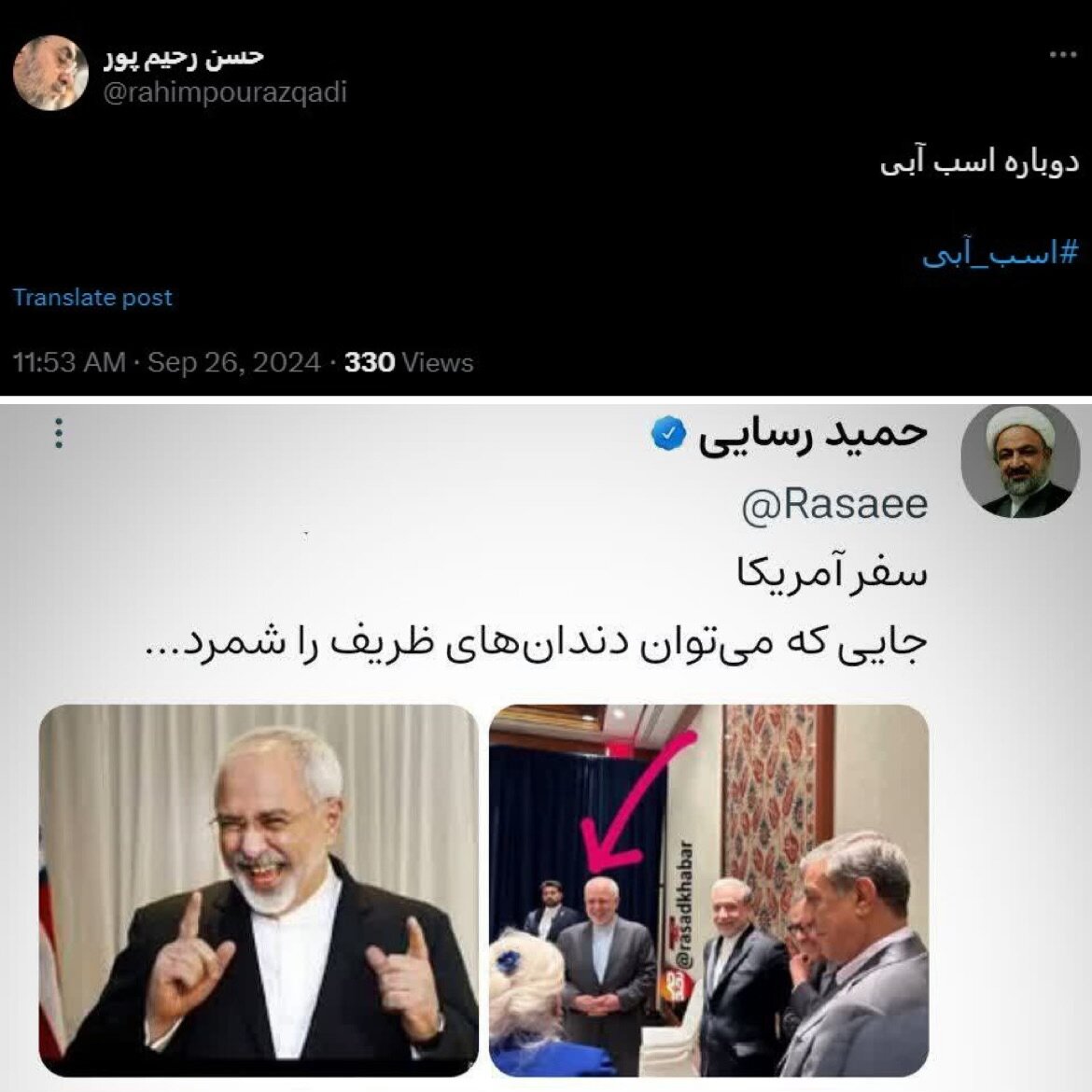 در ادامه همین خط، حمید رسائی نماینده تندرو تهران در مجلس نیز در شبکه اجتماعی ایکس، تصاویری از محمدجواد ظریف منتشر کرده و نوشته است: «سفر آمریکا، جایی که میتوان دندانهای ظریف را شمرد...»