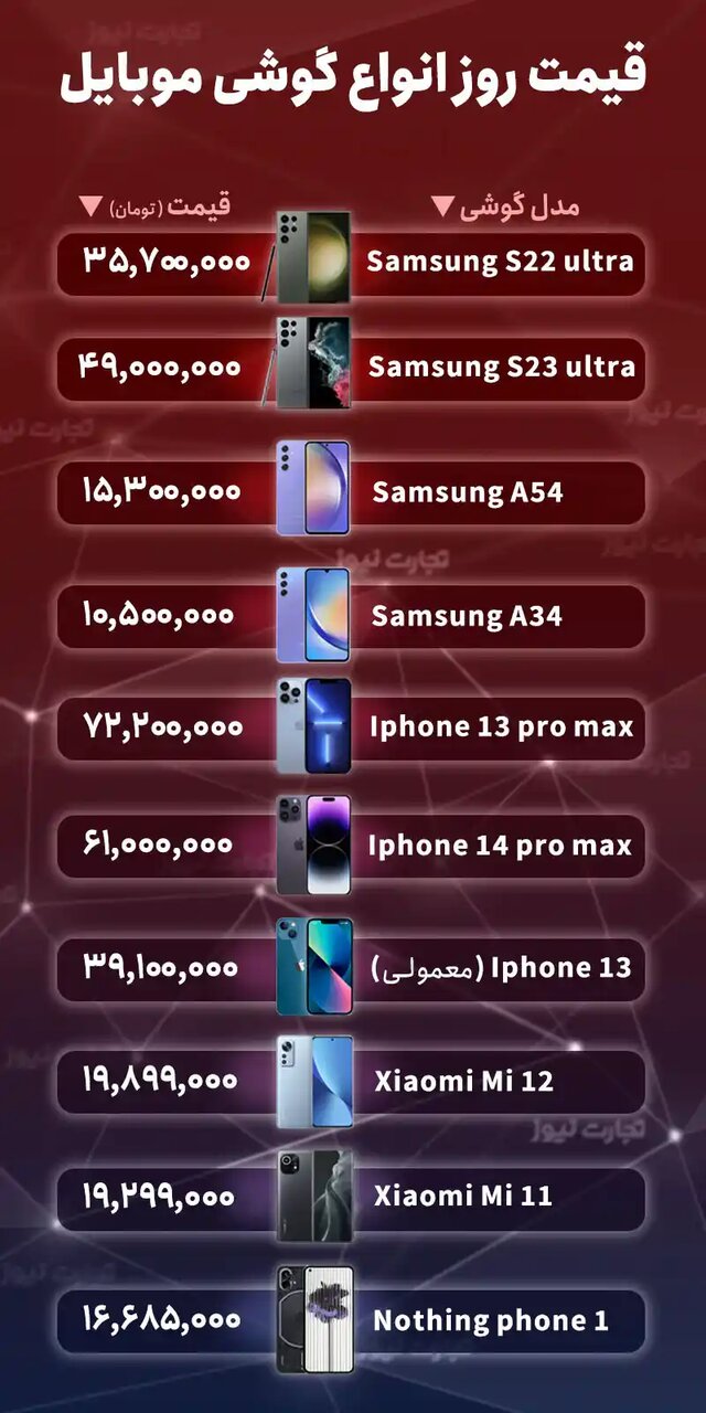 قیمت گوشی موبایل امروز 29 مرداد 1402